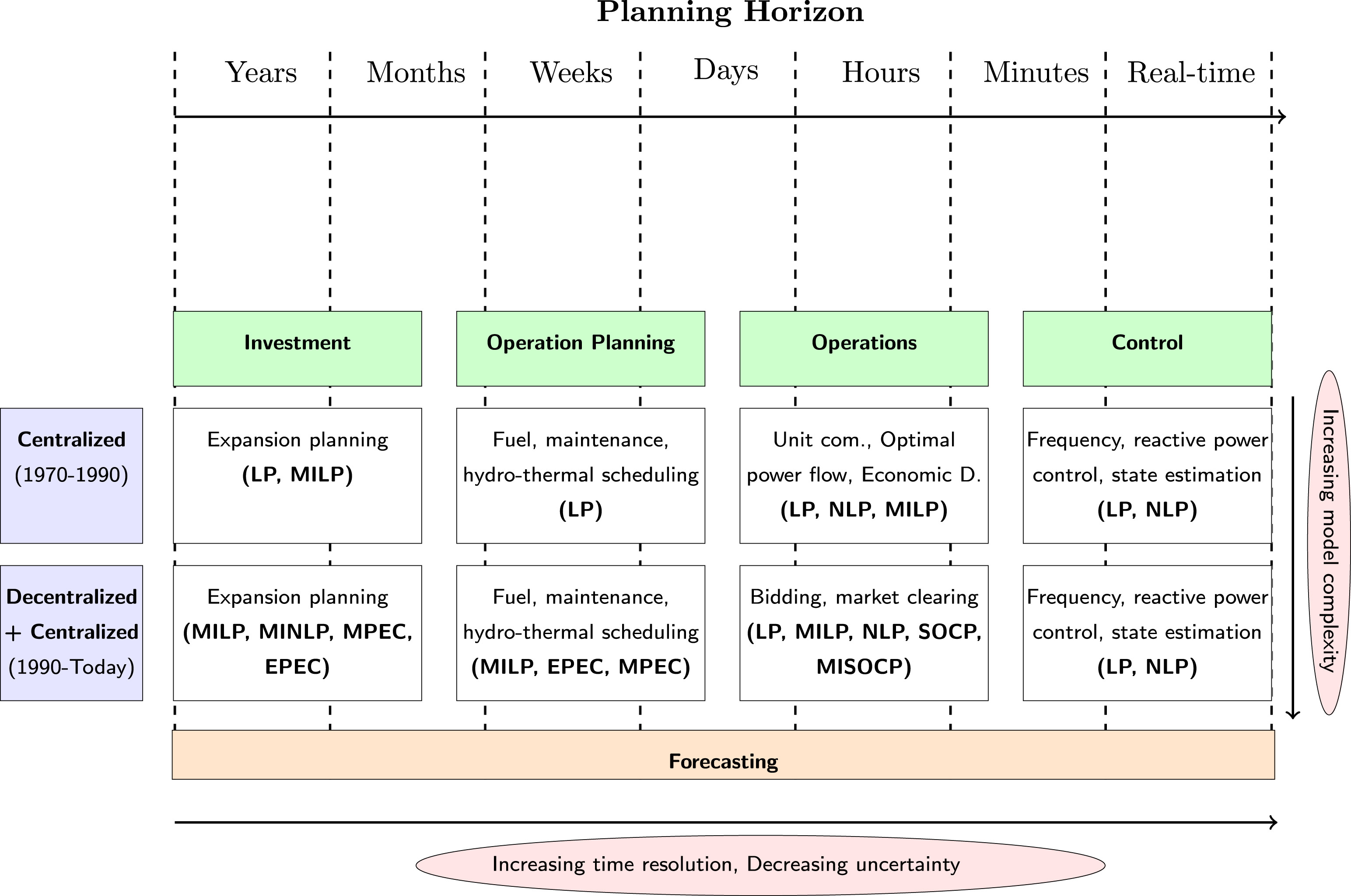 While these main problems do not by themselves represent a full power system analysis, they reflect the main streams of research on power systems optimization. Investment problems consider a planning horizon spanning from years to several decades, with decisions related to generating units, transmission lines and distribution systems being determined. Operation planning problems can span from days to years and encompass maintenance planning for lines, transformers and generators, fuel procurement planning and hydro-thermal scheduling. Operations problems, which often extend over minutes to days, determine scheduling and dispatch decisions. Control problems, aimed at ensuring the stability of the entire power system, cover horizons ranging from real-time to minutes.